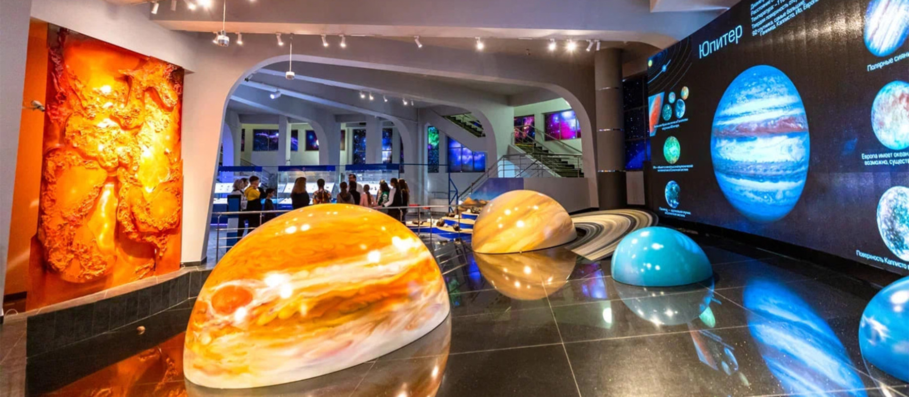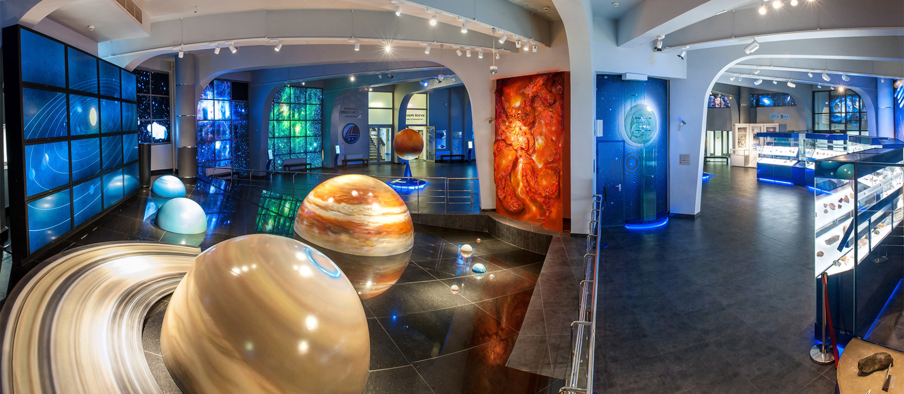 Миры Солнечной системы представлены и на наклонном мраморном пандусе – в виде полусфер планет. Большой экран-видео стена позволяет рассмотреть 3-х мерные модели тел Солнечной системы в деталях и узнать о них много интересного.