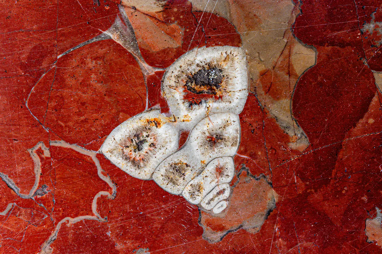 На выставке представлены образцы этих животных. Из фондов ГБМТ- ископаемая многооборотная раковина длиной 15 см, найденная в юрских отложениях в Рязанской области. Московское метро нас порадовало юрским брюхоногим моллюском длиной 7 см на полу из красного грузинского мраморовидного известняка на станции метро «Ленинский проспект». И его меловым родственником размером12 см в облицовке станции «Цветной бульвар» (переход на Трубную), выполненной из бежевого мраморизованного известняка, привезённого из Италии.